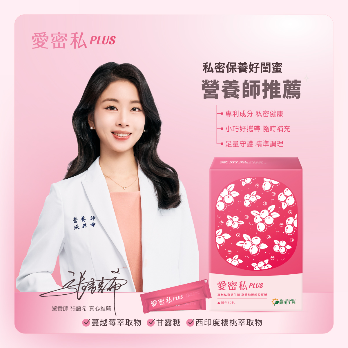 成分:玉米澱粉、乳糖(乳糖、麥芽糊精)、甘露糖、蔓越莓萃取物、蔓越莓果汁粉(砂糖、麥芽糊精、蔓越莓濃縮汁、香料、檸檬酸、檸檬酸鈉、紅甜菜汁、婀娜多色素、梔子藍色素)、西印度櫻桃萃取物(麥芽糊精、維生素C、西印度櫻桃萃取物)、果寡糖、專利私密複合益生菌[乳酸菌(瑞士乳桿菌LA25、乳酸乳桿菌LDL114、植物乳桿菌LP115、醱酵乳桿菌LF26、鼠李糖乳桿菌LRH10、副乾酪乳桿菌LPC12)、麥芽糊精、微結晶狀α-纖維素]、流行鏈球菌發酵物(含透明質酸鈉)